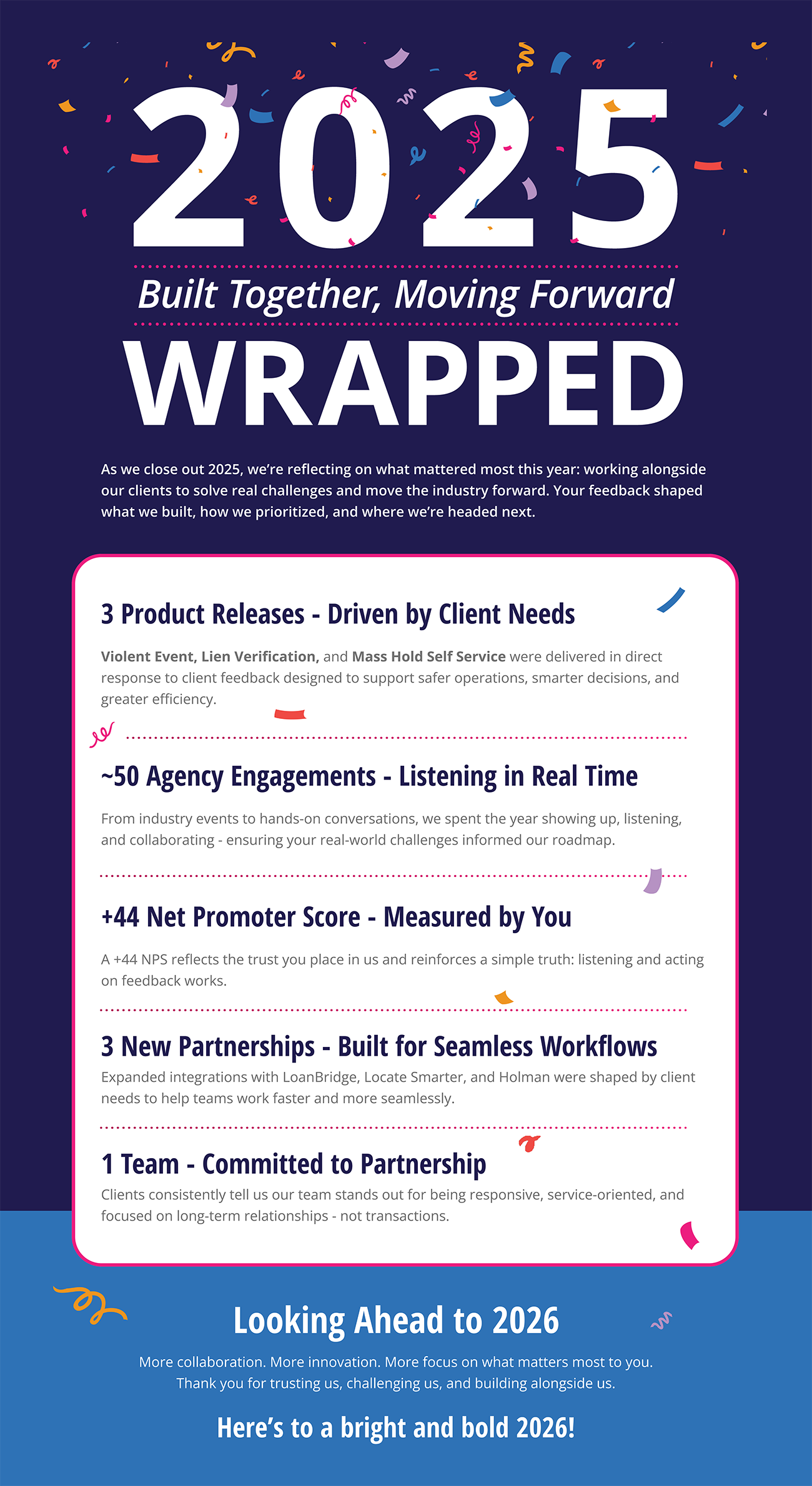 Violent Event, Lien Verification, and Mass Hold Self Service were delivered in direct response to client feedback designed to support safer operations, smarter decisions, and greater efficiency.